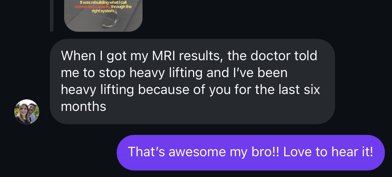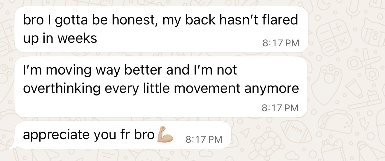 Today, Andrew trains consistently, lifts with confidence, and no longer plans his workouts or his life around his spondy. The flare-ups are under control. The fear is gone. And his back no longer feels like the weak link.